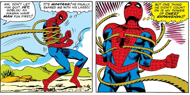 The power of chest expansion interestingly first appeared alongside the first appearance of Spider-Man’s greatest nemesis – the Green Goblin. He manages to track down Spider-Man and send him into a trap disguised as a paid movie appearance gig. When Spider-Man ends up getting attacked by a group of supervillains waiting for the masked hero, he ends up getting caught by Montana’s lasso. It’s at this moment he uses the strange chest expansion superpower, one which allowed him to break free of the lasso and escape.