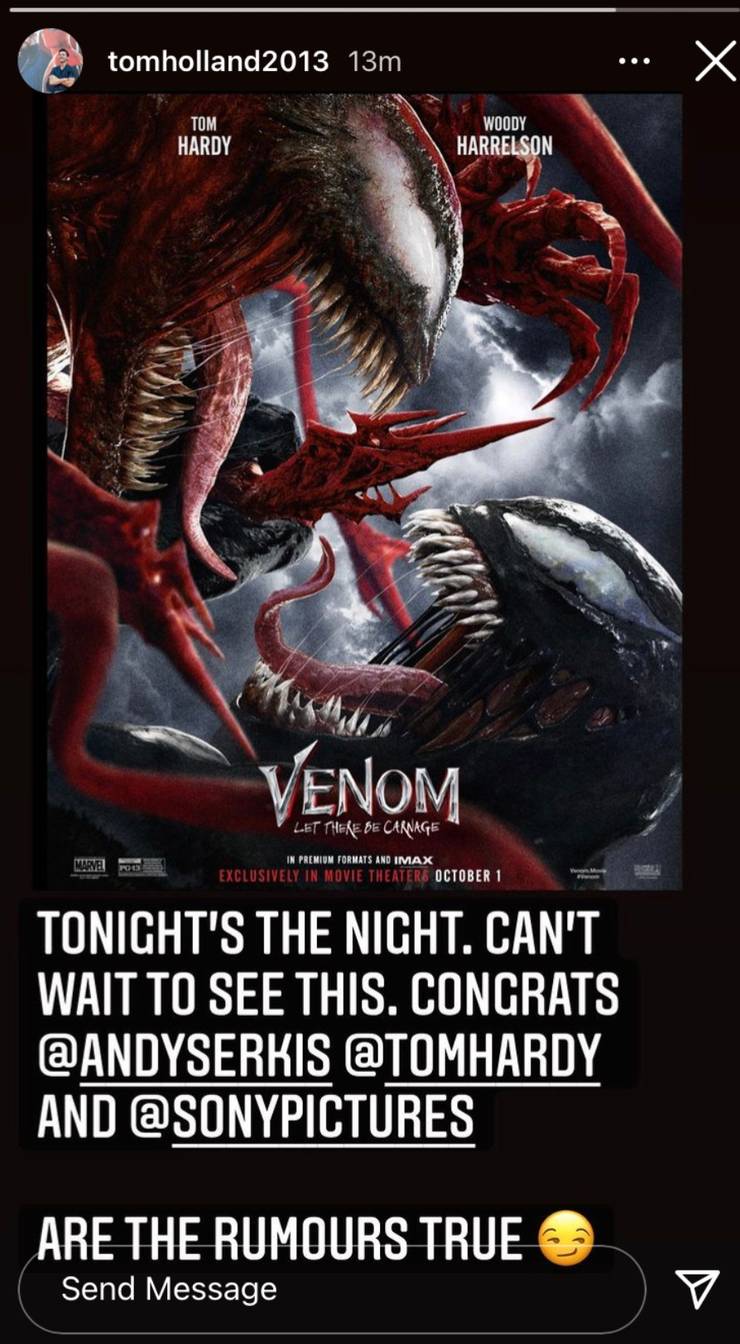 Tom Holland took to Instagram to acknowledge and congratulate director Andy Serkis and star Tom Hardy on the release of their sequel. But, the most noteworthy part is the little final line of the post that says “are the rumors true” with a smirking emoji. Now, in hindsight, this is obviously a spoiler. Venom has crossed over to the Marvel Cinematic Universe, thanks most likely to both the broken multiverse from Loki as well as Doctor Strange’s tampered spell we saw in the trailer for Spider-Man: No Way Home.